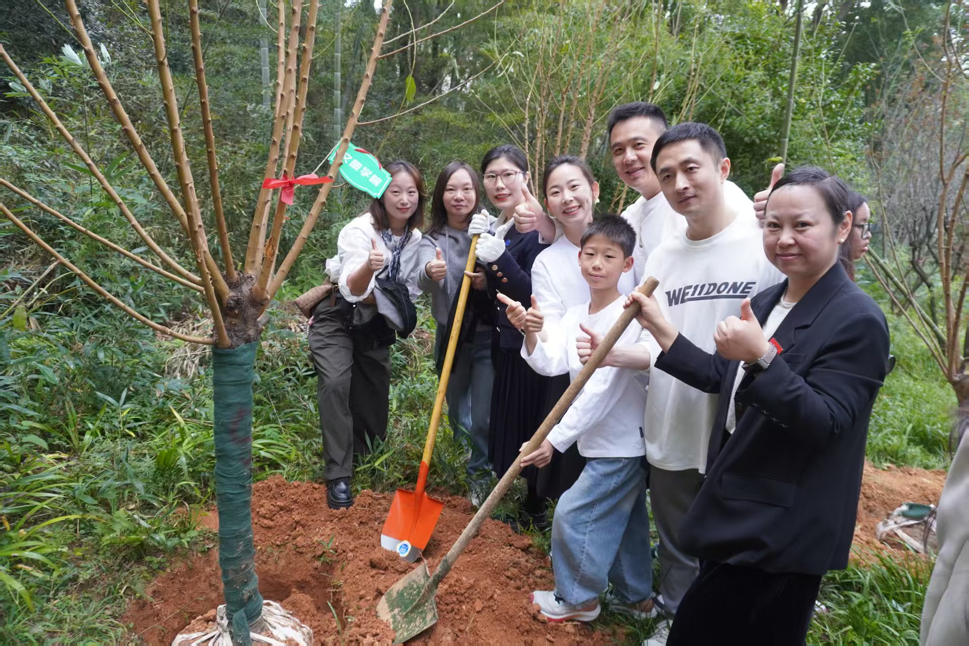 三天后,一场跨越时空的“思政接力”在此延续。10月28日,文旅学院旅游会展专业学生党支部开展“寻根铸魂・绿树传心”主题党日活动,师生党员为校友认捐树木挂牌,在山林间上了一堂沉浸式微党课。党委副书记黄瑾现场讲授“初心”微党课:要记得“寻根”,心怀感恩,无论未来走多远,都不能忘记自己从母校这片土壤出发;要像树一样“铸魂”,牢牢扎根、不惧风雨,脚踏实地成长为有力量的人。