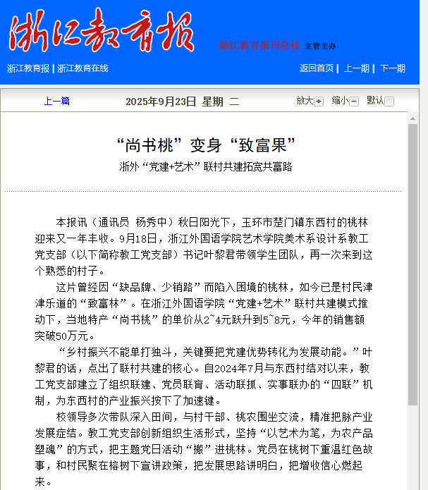 报道指出,2024年7月结对后,支部构建起“组织联建、党员联育、活动联抓、实事联办”的“四联”机制,为东西村发展按下“加速键”。支部还将助农融入课堂,《包装设计》课引入“尚书桃”设计项目。党支部书记牵头成立品牌设计小组,党员教师发挥专业优势,开启了“艺术赋能农产品”实践。设计中,团队反复打磨:重构玉环传统纹样,让包装有地方特色;融入书法笔触,让“尚书桃”三字更有文化味;用环保材质,既符绿色理念,又提产品质感。